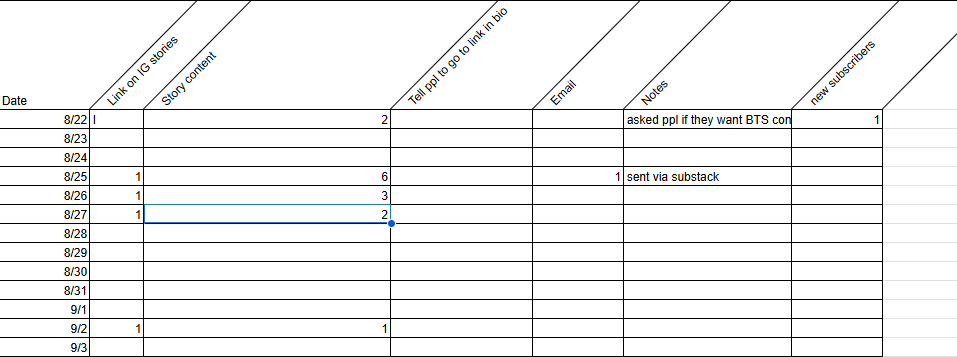 It took me a bit to get used to. I stopped keeping track of this because the dread of having to mark it down in a spreadsheet stopped me from doing it. Instead, my new goal is to share a link to one of my Substack articles on Instagram, to my email list or on Notes, at least once a day. Again, being honest. I haven’t gotten that consistent on it yet. But I will say that I’ve shared article links maybe 2-3 x / week… which is better than nothing.
